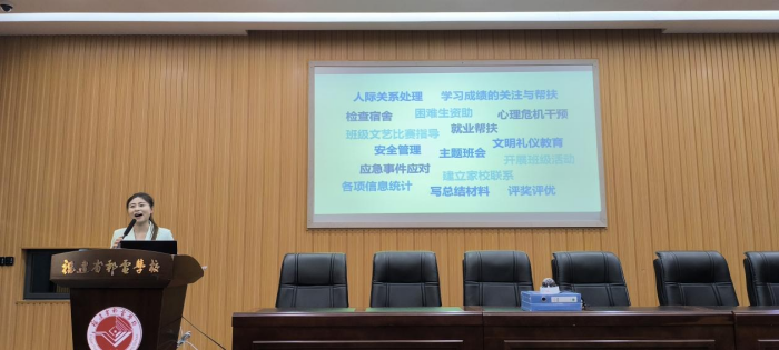為加強(qiáng)班主任隊(duì)伍建設(shè),進(jìn)一步提升班主任的理論素養(yǎng)和職業(yè)技能,更好地助力學(xué)校各項(xiàng)教育教學(xué)工作的開展,近日,我校學(xué)生與保衛(wèi)科在學(xué)術(shù)報(bào)告廳舉辦班主任專題培訓(xùn)會(huì),邀請(qǐng)福建水利電力職業(yè)技術(shù)學(xué)院學(xué)生思想政治教育科科長莊立薇老師主講。我校全體班主任、學(xué)生與保衛(wèi)科全體人員參會(huì),校黨委委員、副校長林鵬出席會(huì)議并作總結(jié)講話。會(huì)議由學(xué)生與保衛(wèi)科科長張仁美主持。