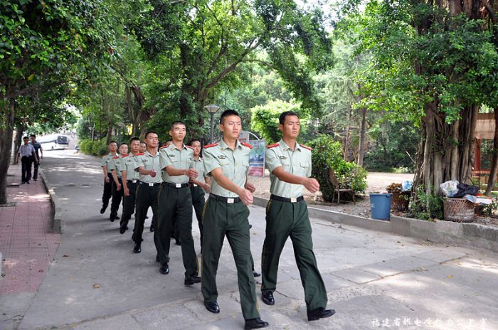 筆直的身軀,干凈的面龐,矯健的步伐,鏗鏘有力的聲音……他們一出場,便吸引了所有人的目光,2013年8月19號8點10分武警福建省總隊直屬支隊陳俊民隊長帶領13名官兵入駐我校。他們戎裝在身,在學生與保衛(wèi)科陳科長的帶領下,熟悉校園的基本環(huán)境,了解新生的住所(5號樓、6號、7號樓),陳科長還向其介紹認識了管理新生的生管老師。