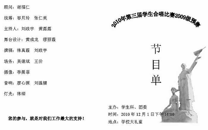 您現(xiàn)在的位置: 首頁(yè) > 德育教育 > 德育活動(dòng)德育活動(dòng) 2010年第三屆學(xué)生合唱比賽預(yù)賽節(jié)目單 發(fā)布時(shí)間:2010-12-02 //echo ;?> 來(lái)源:學(xué)生科、團(tuán)委點(diǎn)擊: 上一篇:2010年拔河比賽對(duì)陣表(第一輪) 下一篇:2010年“閃亮之星”校園十佳歌手大賽落下帷幕
