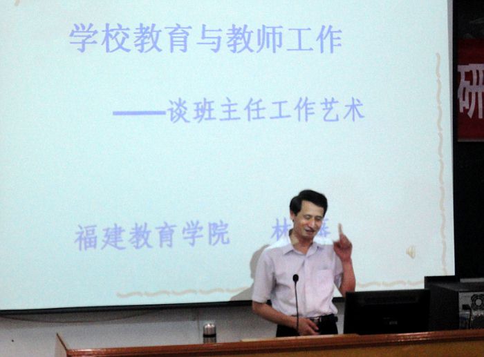 隨后,福建省教育學(xué)院師訓(xùn)處林藩處長(zhǎng)給與會(huì)老師做了《漫談班主任工作藝術(shù)》的精彩講座。林藩處長(zhǎng)以幽默的語言、從班主任應(yīng)把握的工作環(huán)節(jié)、班主任形象的體現(xiàn)、班主任工作的原則、班主任工作的方法等幾個(gè)方面對(duì)班主任工作的藝術(shù)進(jìn)行了精彩的詮釋。林處長(zhǎng)語言幽默、形象生動(dòng),講座博得了老師們陣陣的掌聲。