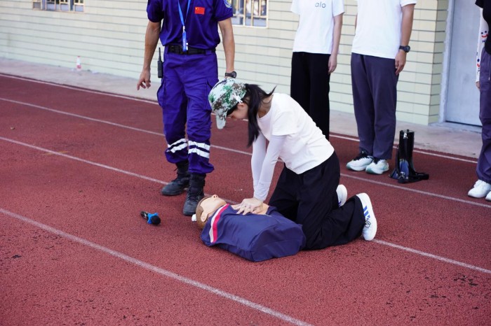 教官們還穿插講解心肺復(fù)蘇與中暑處置:通過模擬人演示胸外按壓節(jié)奏,強(qiáng)調(diào)“雙手交疊、肩肘垂直”的發(fā)力技巧;拆解高溫訓(xùn)練中“轉(zhuǎn)移至陰涼處—冰袋冷敷—補(bǔ)充電解質(zhì)”的科學(xué)處置流程。學(xué)生們在情景模擬中分組演練,從慌亂到有序,逐步提升應(yīng)急能力。