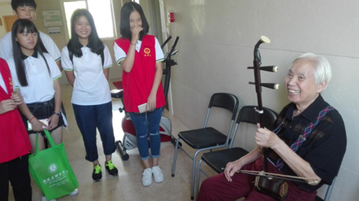 進(jìn)入老年公寓,同學(xué)們首先被悠揚(yáng)的二胡聲所吸引,尋聲走去,是位年過80的老奶奶正在拉奏二胡,同學(xué)們熱情與她打招呼,并詢問身體、子女情況、興趣愛好等。一時(shí)興起,老奶奶便與同學(xué)們一起合唱《套馬桿》《紅星閃閃》等歌曲,不亦樂乎。