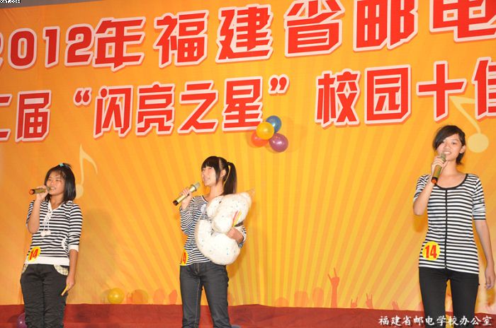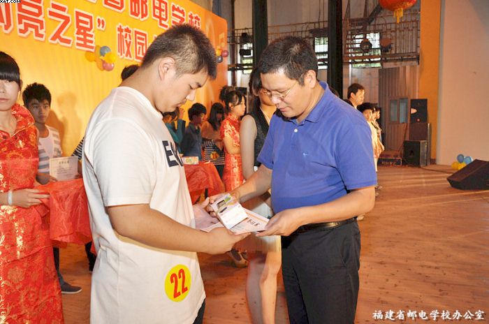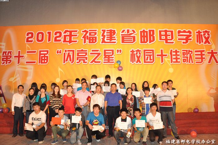經(jīng)過(guò)激烈的角逐和現(xiàn)場(chǎng)計(jì)分,通信1204班杜為秋以一首《花火》獲得冠軍,經(jīng)貿(mào)1104班林茜薇,通信1201班施凈浄,通信1207班杜晨宇,通信1205班李文琴,通信11大專(zhuān)李淑銘,通信1207班念白玲,通信1103班藺昊,通信1106班江少東、黃偉偉(組合),網(wǎng)絡(luò)12大專(zhuān)彭盧彬等10組同學(xué)獲得校園“十佳歌手”稱(chēng)號(hào),并免費(fèi)獲得由中國(guó)電信贊助的智能手機(jī)一部。通信1103班張鵬,通信12大專(zhuān)潘晨語(yǔ),通信1103班林宇樞,通信1206班葉張艷,通信1104班王穎芳,通信11大專(zhuān)林婧,經(jīng)貿(mào)1103班吳凱莉,通信1205班鄭仁鵬,通信1107班章智雄,通信1104班柯冰鑫,通信12大專(zhuān)占美枝、林真、王志君(組合),通信1202班鄭銘等同學(xué)分別獲得“優(yōu)秀歌手”稱(chēng)號(hào)。副校長(zhǎng)、黨委副書(shū)記謝福仁老師親自為獲得“十佳歌手”的選手頒發(fā)榮譽(yù)證書(shū)及獎(jiǎng)品。