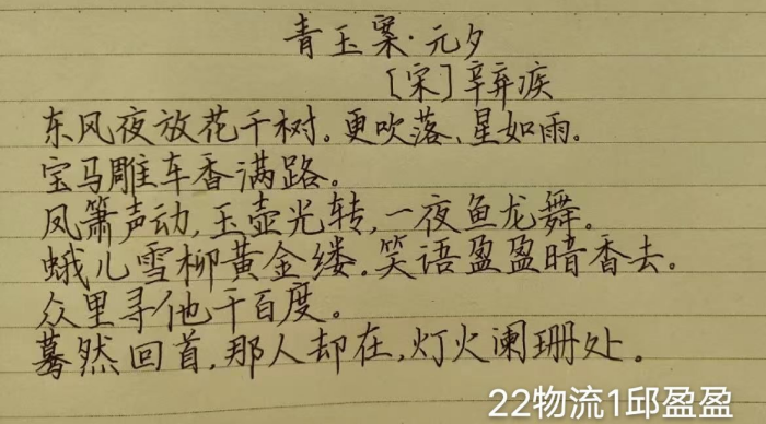 書香染墨韻,漢字傳詩情。中國詩詞是人類文明的瑰寶,元宵節(jié)自古以來就是文人墨客抒發(fā)情感、留下傳世佳作的時(shí)刻。福郵學(xué)子們通過書寫以“元宵節(jié)”為主題的詩詞,不僅在詩詞中體會了元宵節(jié)的文化魅力,更是用漢字的力量傳承著民族精神,弘揚(yáng)了中國文化。