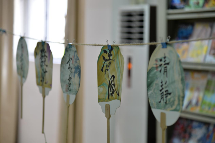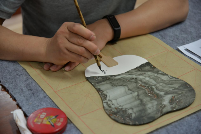 此次活動(dòng)還將非遺漂漆文化與書法、蓋章藝術(shù)相融合,在書法社指導(dǎo)老師林志團(tuán)的帶領(lǐng)下,書法社同學(xué)為師生在扇子上寫下美好的祝福,在歡聲笑語中,一把把獨(dú)一無二、精巧別致的書法漆扇、一張張精美的書簽呈現(xiàn)在眼前。它們是傳統(tǒng)技藝與美學(xué)的多元融合,讓傳統(tǒng)手工技藝兼具實(shí)用與美感。