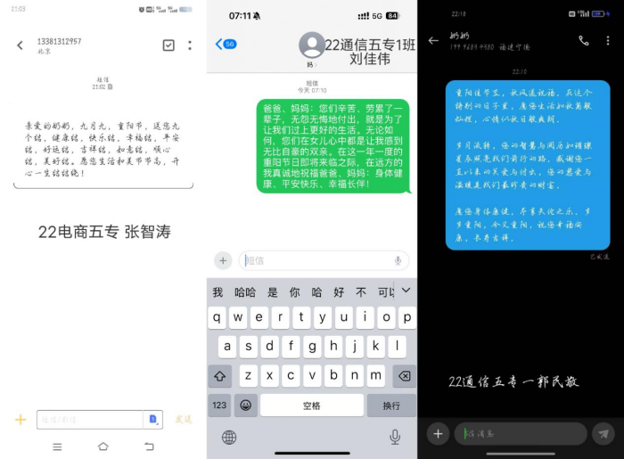 感恩有您,情暖重陽;顒(dòng)期間,在校學(xué)子通過電話、短信、微信等方式表達(dá)對(duì)家中長輩的思念與祝福。一聲聲“爺爺,重陽節(jié)快樂”“奶奶,您辛苦了”“祝您身體健康,萬事如意”等簡單質(zhì)樸的話語飽含了同學(xué)們的片片真情,體現(xiàn)了福郵學(xué)子對(duì)長輩的感激和敬意。