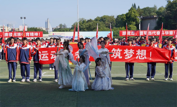 運(yùn)動(dòng)員們手中紅旗迎風(fēng)飄揚(yáng),活力四射的玩偶、熱情洋溢的舞姿贏得陣陣掌聲。