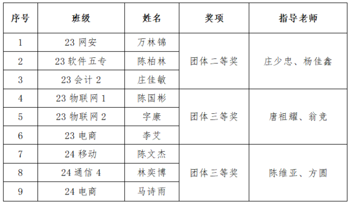 在校黨委委員、副校長林鵬的帶領(lǐng)下,我校盧志贏、陳維亞、李章春、熊匯林、陳燁、唐祖耀六位青年教師代表省教育廳參賽;12名學(xué)生代表福建省郵電學(xué)校出賽。經(jīng)過激烈角逐,我校教師代表教育廳參賽榮獲省直機(jī)關(guān)組二等獎(jiǎng),學(xué)生代表隊(duì)則在中職學(xué)生組中榮獲一個(gè)團(tuán)體二等獎(jiǎng)和兩個(gè)團(tuán)體三等獎(jiǎng)的好成績!