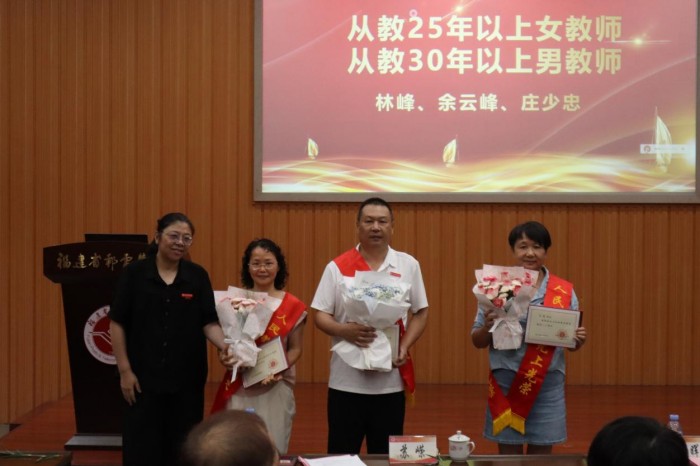 校長蘇嶸為從教25年以上女教師林峰、余云峰和從教30年以上男教師莊少忠頒發(fā)了從教榮譽(yù)證書,以此致敬他們?yōu)閷W(xué)校發(fā)展作出的無私貢獻(xiàn)。學(xué)生代表向他們獻(xiàn)上鮮花,表達(dá)敬意。