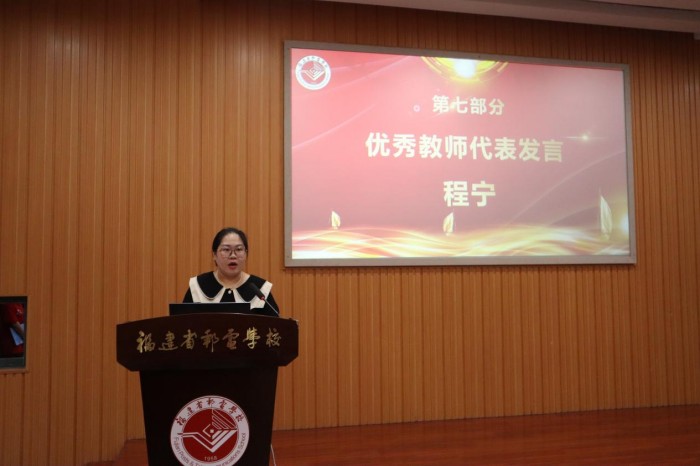 優(yōu)秀教師代表程寧上臺發(fā)言,她表示作為教育工作者,要牢記為黨育人、為國育才的初心使命,以熱愛為帆,以使命為舵,在祖國復(fù)興的征程中,共同書寫屬于教育者的榮光。