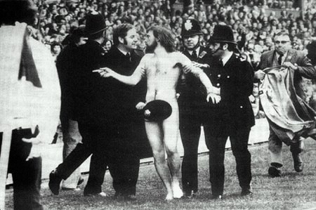 在1975年英聯(lián)邦橄欖球決賽上,包括伊利莎白女王在內(nèi)的英國(guó)政要聚集在主席臺(tái)上。這個(gè)體型優(yōu)美的裸跑者-澳大利亞會(huì)計(jì)師米歇爾.奧.布瑞恩正跑過(guò)球場(chǎng)的看臺(tái)前。據(jù)報(bào)導(dǎo),面對(duì)這個(gè)尷尬場(chǎng)面,女王差點(diǎn)暈過(guò)去。后來(lái),布瑞恩以“有傷風(fēng)化罪”被判三個(gè)月監(jiān)禁。