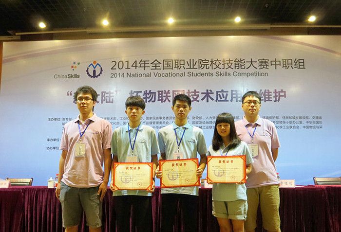 2014年6月21日,2014年全國職業(yè)院校技能大賽(中職組)“新大陸”杯物聯(lián)網(wǎng)技術應用與維護大賽在杭州市浙江經(jīng)貿(mào)職業(yè)技術學院隆重舉行,來自全國25個省市61支參賽隊的183名選手匯聚一堂、比拼技能。我校參賽隊伍由指導教師:陳銘、林南,選手:葉鑫鑫(通信11五年專)、陳慧(通信11五年專)、鄒建武(通信1302班)組成。該國賽項目為三人團體項目,在歷時三個小時的競賽過程中,選手們就物聯(lián)網(wǎng)感知層設備安裝與調(diào)試、物聯(lián)網(wǎng)網(wǎng)絡傳輸層連接與配置、物聯(lián)網(wǎng)應用層系統(tǒng)的部署與配置、物聯(lián)網(wǎng)應用系統(tǒng)的使用與維護與職業(yè)素養(yǎng)等項目的競賽內(nèi)容展開激烈角逐。競賽最終的評測總分由上機操作與筆試作答兩部分構成。本次競賽,我校代表隊準備充分、組織嚴密、協(xié)調(diào)得當,一舉獲得了該項目團體二等獎的好成績。該項目是第一次納入全國職業(yè)院校技能大賽,我校代表隊首次參賽就斬獲如此佳績,充分展示了我校物聯(lián)網(wǎng)技術應用專業(yè)的教學質(zhì)量和水平以及我校師生奮發(fā)進取的精神風貌。此次大賽以新興產(chǎn)業(yè)發(fā)展為契機,有力促進了校企合作,為進一步提升物聯(lián)網(wǎng)人才培養(yǎng)水平提供了新的平臺。