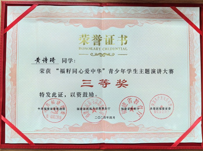 日前,由中共福建省委統(tǒng)戰(zhàn)部、福建省民族與宗教事務(wù)廳、福建省教育廳、共青團(tuán)福建省委聯(lián)合舉辦的“福籽同心愛(ài)中華”青少年學(xué)生主題演講大賽圓滿落下帷幕,大賽共評(píng)選出高中、中職組一等獎(jiǎng)2名、二等獎(jiǎng)5名、三等獎(jiǎng)7名、優(yōu)秀獎(jiǎng)9名。我校參賽選手黃詩(shī)琦在團(tuán)委翁競(jìng)老師、楊佳鑫老師指導(dǎo)下,榮獲三等獎(jiǎng),我校也是唯一獲獎(jiǎng)的省屬中職學(xué)校。
