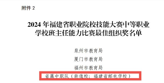 近日,2024年福建省職業(yè)院校技能大賽中等職業(yè)學(xué)校班主任能力比賽圓滿落下帷幕。我校作為省屬中職學(xué)校班主任能力比賽的輪值校,榮獲“最佳組織獎”。此次獲獎是對我校賽事承辦和組織協(xié)調(diào)的充分肯定,也是對學(xué)校教育教學(xué)水平和管理能力的高度評價。