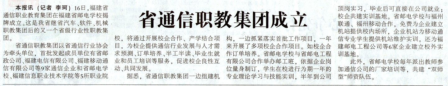 16日,福建省通信職業(yè)教育集團在福建省郵電學校揭牌成立。這是我省繼省汽車、軟件、機械職教集團后的又一個省級行業(yè)性職教集團。