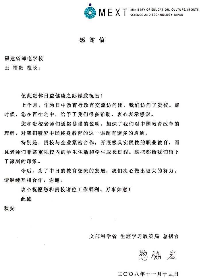 您現(xiàn)在的位置: 首頁 > 學(xué)校信息 > 合作交流合作交流 日本教育官員發(fā)來感謝信贊我校實(shí)踐教學(xué) 發(fā)布時(shí)間:2008-11-26 //echo ;?> 來源:點(diǎn)擊: 近日,日本文部科學(xué)省教育行政官訪華團(tuán)團(tuán)長惣脇宏發(fā)來感謝信,稱贊我校校企合作和實(shí)訓(xùn)教學(xué)工作。 惣脇宏先生在來信中感謝學(xué)校給予的幫助,感謝老師通俗易懂的說明為他們加深了對我國教育改革的理解和研究我國終身教育的啟迪,我校與企業(yè)緊密合作、實(shí)訓(xùn)教學(xué)、重視學(xué)生生活和成長過程都給他們留下了深刻的印象,并愿加強(qiáng)交流合作。 上一篇:我校召開福建省通信行業(yè)中等職業(yè)教育指導(dǎo)委員會(huì) 下一篇:日本文部科學(xué)省教育行政官訪問團(tuán)到我校訪問