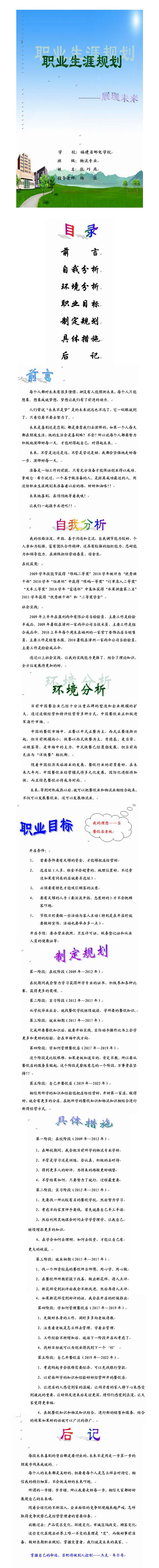(三)內(nèi)容要求:規(guī)劃符合中職學生實際,符合國情,腳踏實地;能處理好“人選職業(yè)”、“職業(yè)選人”的辨證關系,有“興趣能培養(yǎng)、性格能調(diào)適、能力能提高”做個性主人的措施,有珍惜在校生活,以即將從事的職業(yè)對從業(yè)者的要求為標準提高自身素質(zhì)的安排,追求職業(yè)生涯的可持續(xù)發(fā)展。能從職業(yè)的角度了解自己、了解社會,從本人條件、發(fā)展需要和經(jīng)濟社會、行業(yè)發(fā)展需要出發(fā),分析到位、目標實在、臺階合理、措施翔實。