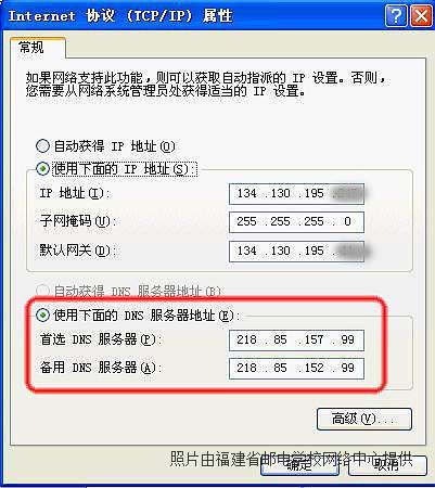 由于電信DNS更改,從近日起,請各科室將自己電腦IP設(shè)置中的DNS設(shè)置為218.85.157.99,備用218.85.152.99,請相互轉(zhuǎn)告、及時更改,否則不能上網(wǎng)。