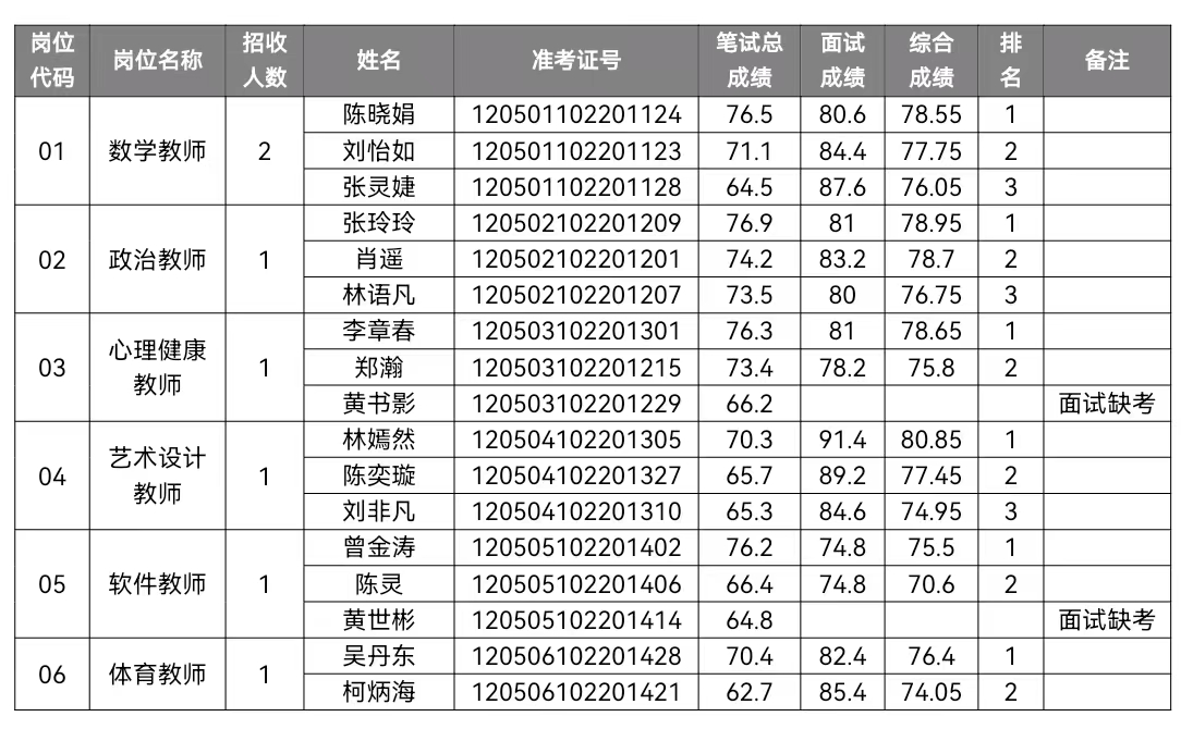 您現在的位置: 首頁 > 招聘就業(yè) > 教師招聘教師招聘 2024年福建省郵電學校公開招聘工作人員入圍面試考生綜合成績公告 發(fā)布時間:2024-06-09 //echo ;?> 來源:人事科點擊: 根據《2024年福建省省屬事業(yè)單位公開招聘工作人員方案(二)》,經發(fā)布招聘信息、網上報名、資格復審、統(tǒng)一筆試、面試等程序,現將入圍面試各崗位考生按比例(筆試成績占50%,面試成績占50%)折算的綜合成績公告如下: 福建省郵電學校 2024年6月9日 上一篇:關于2024年福建省郵電學校公開招聘工作人員入圍面試考生綜合成績查詢的通知 下一篇:2024年福建省郵電學校公開招聘工作人員遞補考核、體檢人選公告