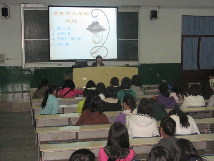 3月25日晚,陳蔚老師在一階教室為同學(xué)們作了一場(chǎng)題為“世界四大未解之謎”的專(zhuān)題講座。會(huì)上,陳蔚老師通過(guò)直觀形象的圖片分別介紹并解釋了水怪之謎、野人之謎、百慕大三角之謎以及UFO之謎。此次講座為同學(xué)們打開(kāi)了科學(xué)探索之門(mén),在場(chǎng)的同學(xué)們皆精神飽滿、熱情高漲,充分體現(xiàn)了同學(xué)們對(duì)世界奧秘的關(guān)注和興趣。
