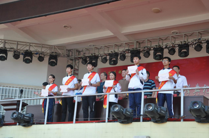 首先,校黨政聯(lián)席會議領導為教師先進集體及先進個人、五星級文明班級及學生先進個人等代表頒獎。其次,劉校長代表學校黨政領導班子向受到表彰的師生先進集體和個人表示熱烈的祝賀,向所有新同學表示熱烈的歡迎和誠摯的問候。他回顧了我校的輝煌歷程,并對全體學生提了以下幾點希望:一、樹立“我能我行”的信心;二、養(yǎng)成良好的習慣;三、練就健康體魄,塑造美麗心靈。他還提醒同學們,國慶期間出行要注意人身和財產(chǎn)安全。最后,祝大家度過一個平安、快樂的國慶假期!