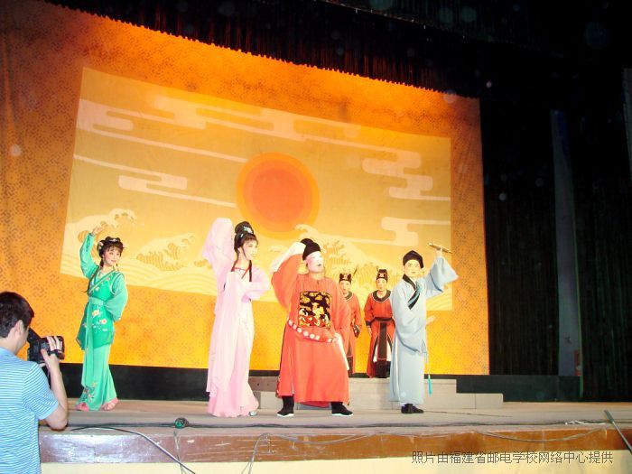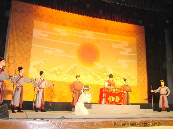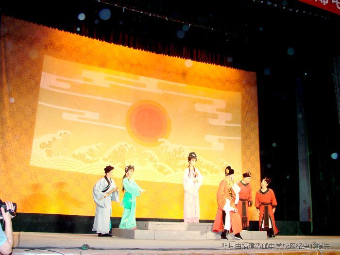 演出在歡快的舞蹈《康定情歌》中拉開(kāi)了帷幕,演員與學(xué)生之間的互動(dòng)隨即將觀眾帶入了閩劇的藝術(shù)境界。閩劇《貶官記》劇情曲折,波瀾起伏,深深地牽動(dòng)著在場(chǎng)每一個(gè)人,藝術(shù)上采取了即現(xiàn)實(shí)又空靈、虛擬的創(chuàng)作方法,既有傳奇色彩又有民眾喜愛(ài)的喜劇表現(xiàn)方法,寓深刻的現(xiàn)實(shí)意義于喜劇之中,雅俗共賞,現(xiàn)為全校師生獻(xiàn)上了一道視聽(tīng)盛宴。