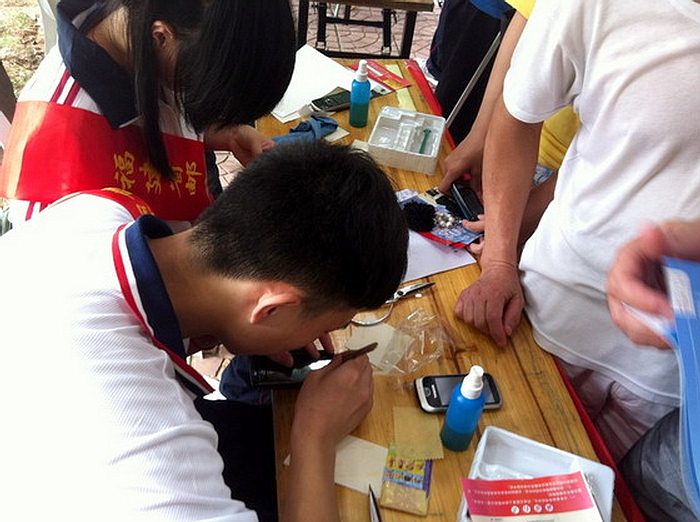 “免費(fèi)手機(jī)貼膜”標(biāo)牌在活動(dòng)現(xiàn)場一出現(xiàn),立刻引來市民的關(guān)注和排隊(duì)。由于事先已分工明確,活動(dòng)時(shí)間雖然未到正式開始,同學(xué)們立刻熱情投入到了為市民免費(fèi)手機(jī)貼膜活動(dòng)中。同學(xué)們不僅發(fā)資料讓市民群眾了解科普日宣傳活動(dòng)的意義、了解郵電學(xué)校,同時(shí)認(rèn)真解答前來探尋的人們的問題。王福貴校長親臨現(xiàn)場。他親切與學(xué)生和市民進(jìn)行交談,讓在場師生更有熱情和積極投入活動(dòng)。同學(xué)的嫻熟技術(shù)和優(yōu)質(zhì)的服務(wù)及品行得到了在場的市民、領(lǐng)導(dǎo)、老師贊同和表揚(yáng)。