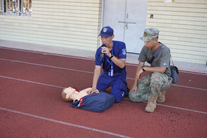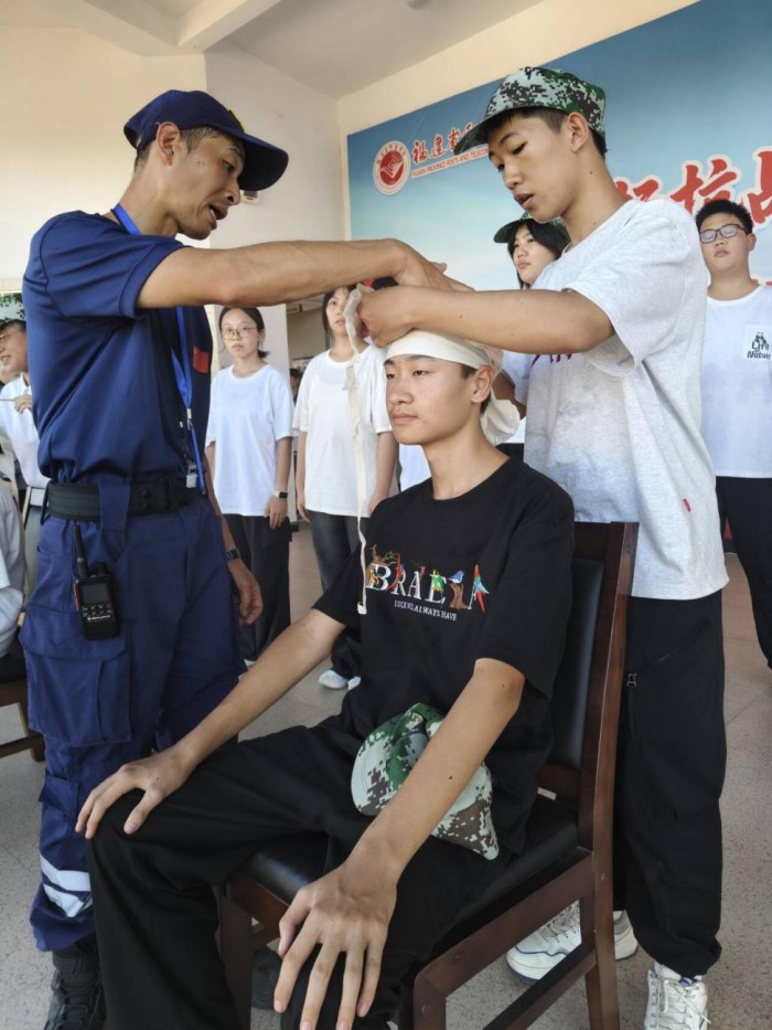 教官們還穿插講解心肺復蘇與中暑處置:通過模擬人演示胸外按壓節(jié)奏,強調(diào)“雙手交疊、肩肘垂直”的發(fā)力技巧;拆解高溫訓練中“轉(zhuǎn)移至陰涼處—冰袋冷敷—補充電解質(zhì)”的科學處置流程。學生們在情景模擬中分組演練,從慌亂到有序,逐步提升應急能力。