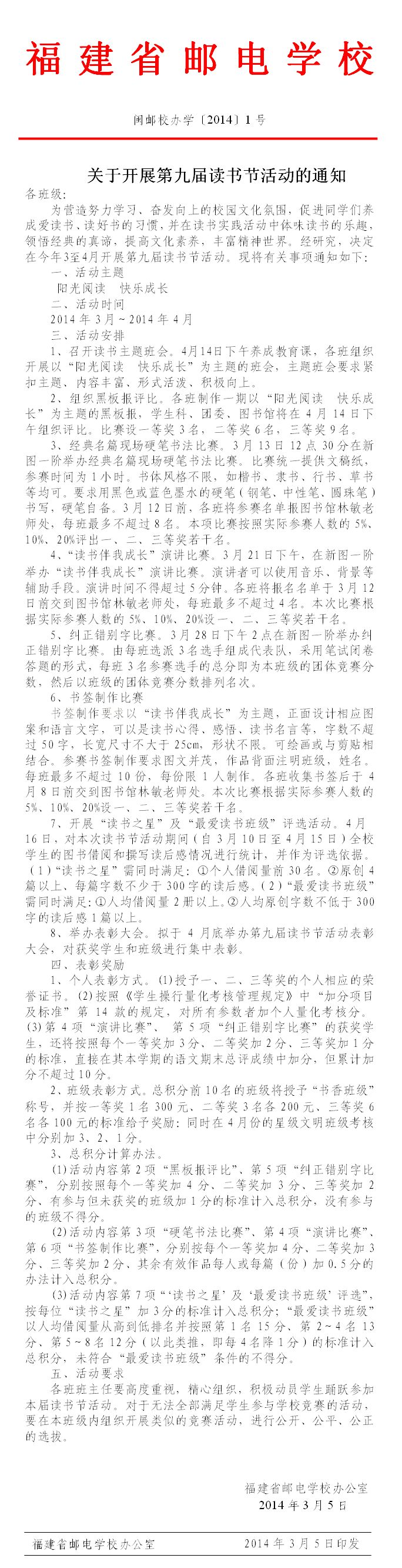 您現(xiàn)在的位置: 首頁 > 德育教育 > 讀書活動讀書活動 關(guān)于開展第九屆讀書節(jié)活動的通知 發(fā)布時間:2014-03-06 //echo ;?> 來源:圖書館點擊: 上一篇:我校第九屆讀書節(jié)“閱讀點亮心靈,學習成就夢想”主題讀書征文活動結(jié)果揭曉 下一篇:我!皭蹖W習、愛勞動、愛祖國”讀書活動暨第八屆讀書節(jié)現(xiàn)場硬筆書法比賽結(jié)果揭曉