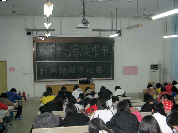 12月19日晚,我校第六屆讀書節(jié)暨“學(xué)雷鋒弘揚福建精神”主題讀書活動之糾正錯別字比賽在新圖一階舉行。這次比賽由每班選派4名選手組成代表隊,采用筆試閉卷答題的形式,每班4名參賽選手的總分即為本班級的團體比賽分?jǐn)?shù),然后以班級的團體比賽分?jǐn)?shù)排列名次。來自全校各班級的120名選手參加了比賽,其中由四位選手林佳敏、鄭紹愛、吳珊、陳露怡組成的經(jīng)貿(mào)1102班代表隊力壓群芳,獲得第一名。