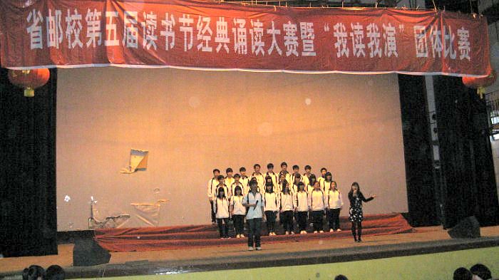 4月23日晚和4月25日下午,我校第五屆讀書節(jié)經(jīng)典誦讀大賽暨“我讀我演”活動(dòng)分別在教學(xué)樓二階和校大禮堂舉行。比賽分兩場(chǎng)進(jìn)行。上半場(chǎng)是經(jīng)典誦讀個(gè)人項(xiàng)目比賽,來自各班的35組選手(個(gè)人或多人)對(duì)中國經(jīng)典詩文的準(zhǔn)確把握和深刻領(lǐng)悟贏得了現(xiàn)場(chǎng)觀眾的陣陣掌聲。經(jīng)過兩個(gè)小時(shí)的激烈角逐,通信1003班的林皓輝、林媛清同學(xué)獲得了一等獎(jiǎng)。下半場(chǎng)是經(jīng)典誦讀集體項(xiàng)目比賽,各班級(jí)代表隊(duì)演繹了《滿江紅》、《祖國啊、我親愛的祖國》、《我愛這土地》、《青春萬歲》等中華經(jīng)典篇目。演出現(xiàn)場(chǎng)秩序井然、場(chǎng)面熱烈。同學(xué)們用詩文表達(dá)愛國情懷,用聲音展示朗誦藝術(shù)的魅力。經(jīng)過一番精彩迭出的比賽,最終,網(wǎng)絡(luò)技術(shù)五年專以全場(chǎng)最高分奪得了一等獎(jiǎng)的桂冠。
