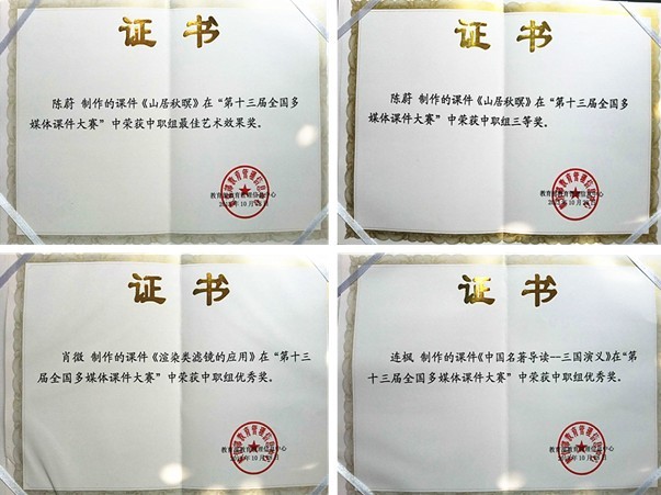 2013年3月,由教育部教育管理信息中心主辦的“第十三屆全國多媒體課件大賽活動”開始在全國范圍內(nèi)面向各級各類院校教師和信息技術(shù)人員征集參賽課件。我校隨即擇優(yōu)選出陳蔚老師的《山居秋暝》、連楓老師的《中國名著導讀--三國演義》和肖微老師的《渲染類濾鏡的應用》三份課件參賽。在經(jīng)歷了國賽評審組兩個多月的初審、復審后,連楓老師和肖微老師的作品獲得了國家優(yōu)秀獎,陳蔚老師的作品則順利通過了復賽,入圍了全國現(xiàn)場決賽。