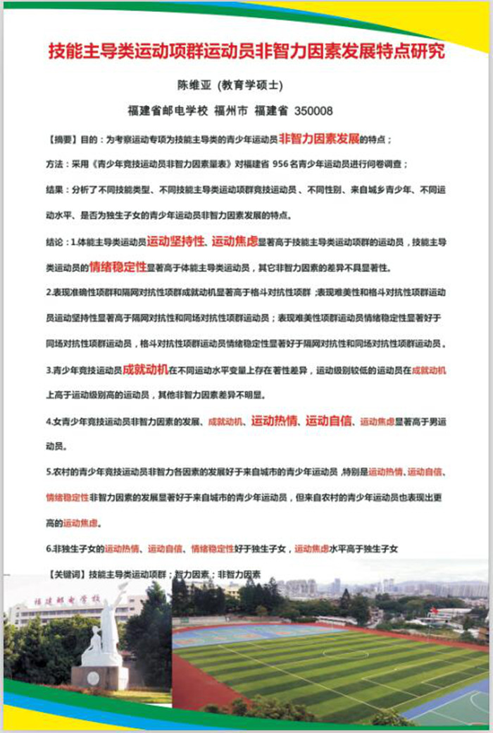 近日,教育廳下發(fā)《福建省教育廳辦公室關(guān)于參加第十三屆全國學(xué)生運(yùn)動會科學(xué)論文報(bào)告會的通知》,我校陳維亞老師撰寫的論文《技能主導(dǎo)類運(yùn)動項(xiàng)群運(yùn)動員非智力因素發(fā)展特點(diǎn)研究》在“第十三屆全國學(xué)生運(yùn)動會科學(xué)論文”比賽中獲得二等獎,并受邀參加第十三屆全國學(xué)生運(yùn)動會科學(xué)論文報(bào)告會。