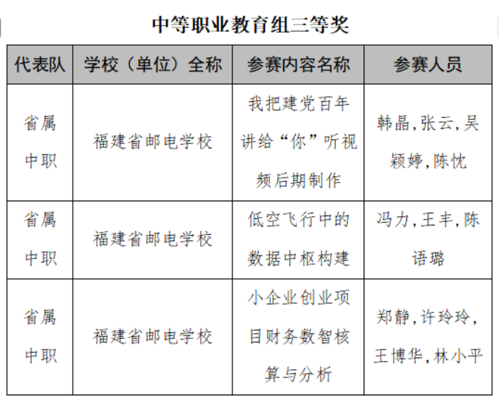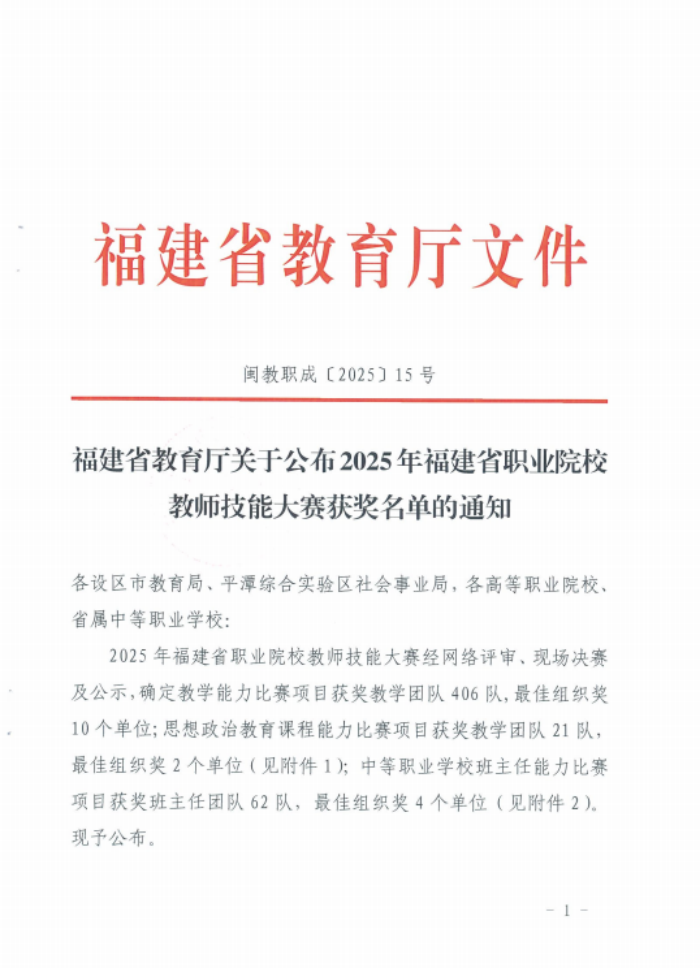 日前,福建省教育廳公布2025年福建省職業(yè)院校技能大賽教學(xué)能力比賽獲獎(jiǎng)名單,我校3支參賽團(tuán)隊(duì)均獲得中等職業(yè)教育組三等獎(jiǎng)。