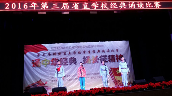 11月27日上午,由福建省直機(jī)關(guān)團(tuán)工委、福建省教育廳直屬機(jī)關(guān)團(tuán)委主辦,省直機(jī)關(guān)學(xué)校團(tuán)建聯(lián)系片承辦的第三屆省直學(xué)校經(jīng)典誦讀比賽在福建工貿(mào)學(xué)校舉行。本次誦讀比賽的主題為“誦中華經(jīng)典,揚(yáng)長征精神”,來自20所院校(中職校12所,本科高職院校8所)參加了比賽。賽前,我校團(tuán)委高度重視,從各班級精心挑選4名同學(xué)組成參賽隊(duì),他們分別是15信息技術(shù)大專班的施詩敏和陳鈴俐、16通信升學(xué)班江海、16網(wǎng)絡(luò)五專班方鴻霖(指導(dǎo)老師:吳禹、陳蔚、劉菁雯)。