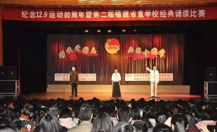 12月9日晚19:30,本次經(jīng)典誦讀的匯報(bào)演出在福建幼兒師范高等專科學(xué)校禮堂舉行。福建省直機(jī)關(guān)工委邱榮副書記、省委教育工委劉劍津副書記等領(lǐng)導(dǎo)蒞臨現(xiàn)場(chǎng)觀看。匯演現(xiàn)場(chǎng),包括我校在內(nèi)的10支中高職優(yōu)秀代表隊(duì)?wèi){借著精彩紛呈的演繹,帶領(lǐng)大家重溫了中華經(jīng)典作品的魅力,獲得了在場(chǎng)觀眾的一致好評(píng)。