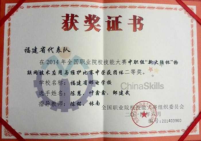 2014年6月21日,2014年全國職業(yè)院校技能大賽(中職組)“新大陸”杯物聯(lián)網(wǎng)技術(shù)應(yīng)用與維護大賽在杭州市浙江經(jīng)貿(mào)職業(yè)技術(shù)學(xué)院隆重舉行,來自全國25個省市61支參賽隊的183名選手匯聚一堂、比拼技能。我校參賽隊伍由指導(dǎo)教師:陳銘、林南,選手:葉鑫鑫(通信11五年專)、陳慧(通信11五年專)、鄒建武(通信1302班)組成。該國賽項目為三人團體項目,在歷時三個小時的競賽過程中,選手們就物聯(lián)網(wǎng)感知層設(shè)備安裝與調(diào)試、物聯(lián)網(wǎng)網(wǎng)絡(luò)傳輸層連接與配置、物聯(lián)網(wǎng)應(yīng)用層系統(tǒng)的部署與配置、物聯(lián)網(wǎng)應(yīng)用系統(tǒng)的使用與維護與職業(yè)素養(yǎng)等項目的競賽內(nèi)容展開激烈角逐。競賽最終的評測總分由上機操作與筆試作答兩部分構(gòu)成。本次競賽,我校代表隊準(zhǔn)備充分、組織嚴(yán)密、協(xié)調(diào)得當(dāng),一舉獲得了該項目團體二等獎的好成績。該項目是第一次納入全國職業(yè)院校技能大賽,我校代表隊首次參賽就斬獲如此佳績,充分展示了我校物聯(lián)網(wǎng)技術(shù)應(yīng)用專業(yè)的教學(xué)質(zhì)量和水平以及我校師生奮發(fā)進取的精神風(fēng)貌。此次大賽以新興產(chǎn)業(yè)發(fā)展為契機,有力促進了校企合作,為進一步提升物聯(lián)網(wǎng)人才培養(yǎng)水平提供了新的平臺。