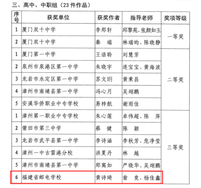 日前,由中共福建省委統(tǒng)戰(zhàn)部、福建省民族與宗教事務(wù)廳、福建省教育廳、共青團福建省委聯(lián)合舉辦的“福籽同心愛中華”青少年學(xué)生主題演講大賽圓滿落下帷幕,大賽共評選出高中、中職組一等獎2名、二等獎5名、三等獎7名、優(yōu)秀獎9名。我校參賽選手黃詩琦在團委翁競老師、楊佳鑫老師指導(dǎo)下,榮獲三等獎,我校也是唯一獲獎的省屬中職學(xué)校。