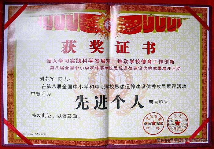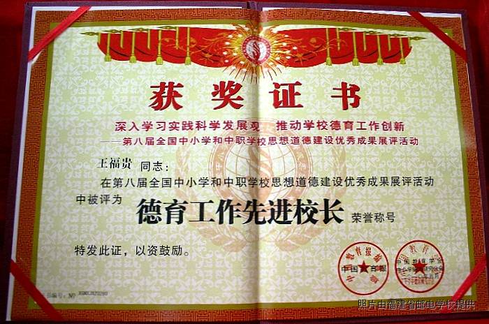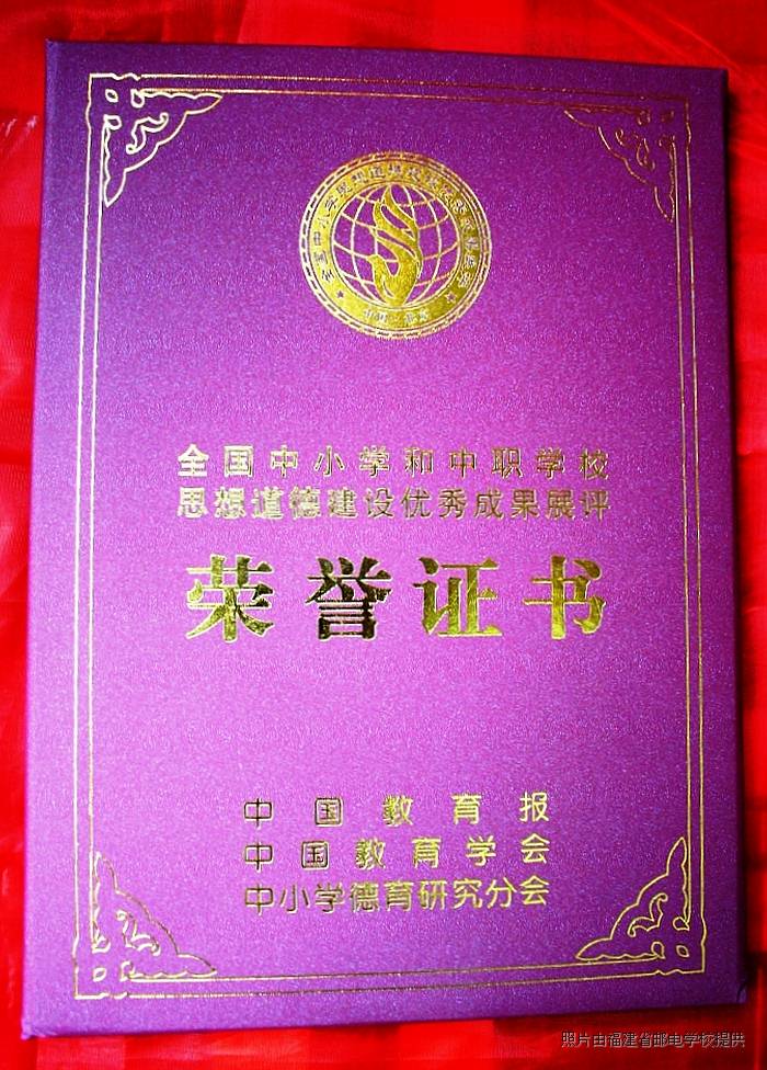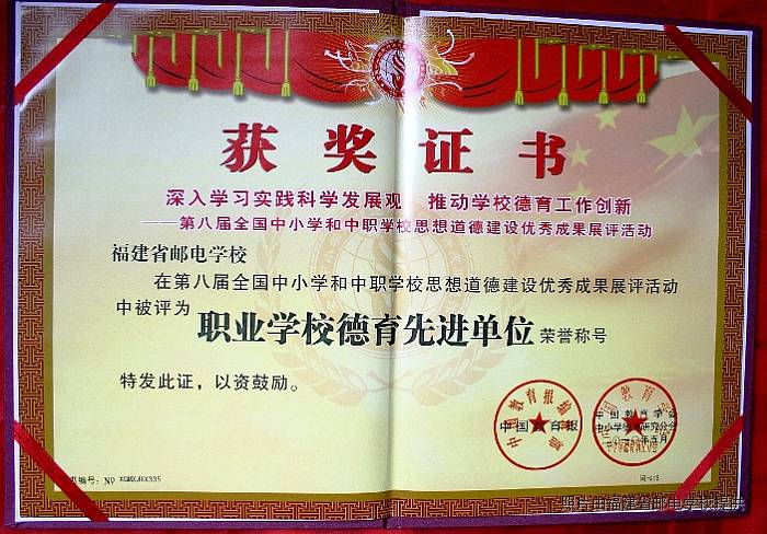 經(jīng)專家評(píng)審委員會(huì)和活動(dòng)組委會(huì)聯(lián)合推薦,福建省郵電學(xué)校被授予第八屆全國(guó)中小學(xué)和中職學(xué)校思想道德建設(shè)優(yōu)秀成果展評(píng)活動(dòng)“職業(yè)學(xué)校德育先進(jìn)單位”和“集體一等獎(jiǎng)”榮譽(yù)稱號(hào),王福貴校長(zhǎng)、劉蘇軍副校長(zhǎng)分別獲得“德育工作先進(jìn)校長(zhǎng)”、“先進(jìn)個(gè)人”。此外,學(xué)校推薦的9篇論文全部獲獎(jiǎng),其中5篇獲得一等獎(jiǎng),4篇獲得二等獎(jiǎng)。