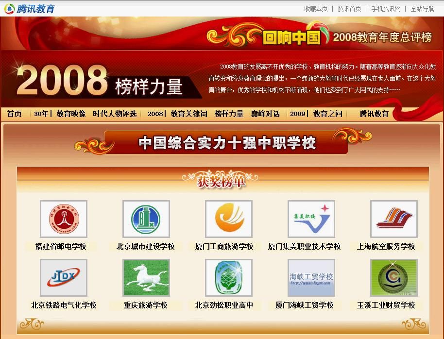 騰訊網(wǎng)騰訊教育頻道舉辦的2008教育年度總評(píng)榜,我校榮登《中國綜合實(shí)力十強(qiáng)中職學(xué)!吩u(píng)比榜的榜首,特此祝賀~!