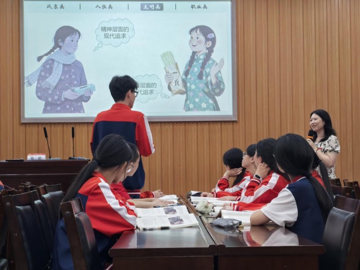陳蔚老師開設(shè)了題為《<哦,香雪>:傳統(tǒng)美與現(xiàn)代美的碰撞》的公開課。課堂上,陳蔚老師帶領(lǐng)學(xué)生解讀文本中的風(fēng)景美、人性美、文明美,引導(dǎo)學(xué)生感悟傳統(tǒng)與現(xiàn)代共生的文化生態(tài)以及普通人在時(shí)代變遷中的精神成長(zhǎng)。