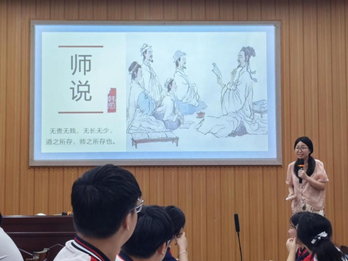 駱麗老師開設(shè)了題為《為師道吶喊:品<師說(shuō)>中的千鈞深情》的公開課。課堂上,駱麗老師帶領(lǐng)學(xué)生品味《師說(shuō)》中的文言虛詞,引導(dǎo)學(xué)生感受文字中的深刻情感。