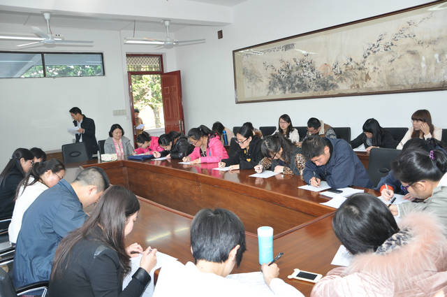 最后,陳處長代表評估組反饋意見。他認為,學(xué)校領(lǐng)導(dǎo)對語言文字工作很重視,認識到位,檔案材料完整,自評報告詳實規(guī)范,校園活動豐富,校園用語用字規(guī)范,自評得分客觀謙虛,重視書法教育和傳統(tǒng)文化的傳承更是學(xué)校語言文字工作的亮點,對學(xué)校出版《硬筆書法教程》、《傳統(tǒng)文化讀本》等校本教程表示贊賞,作為中職學(xué)校這么重視語言文字工作和校園文化建設(shè)確實難能可貴。他對所聽取的語文課也給予了好評,對師生的測試結(jié)果也表示很滿意。同時,他也提出了個別標點符號使用不當(dāng)?shù)燃毼⒌牟蛔恪j愄庨L還對學(xué)校提出了幾點建議:希望學(xué)校今后能進一步重視,尤其是在校園文化建設(shè)上要積極探索,持之以恒;針對學(xué)校專業(yè)特點,加強對學(xué)生語言文字能力的培養(yǎng);動員學(xué)生參加普通話等級測試,既能提高學(xué)生就業(yè)能力,又可帶動校園普通話水平的整體提升。