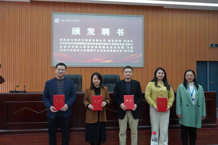 會(huì)議第二階段進(jìn)行校企簽約儀式和頒發(fā)企業(yè)專(zhuān)家聘書(shū)。我校陳霓副校長(zhǎng)代表學(xué)校與福建新大陸時(shí)代科技有限公司、東軟教育科技集團(tuán)進(jìn)行了校企合作簽約,并為來(lái)自福建新大陸時(shí)代科技有限公司、東軟教育科技集團(tuán)、福建神州騰云教育科技有限公司、新道科技股份有限公司的4位企業(yè)專(zhuān)家頒發(fā)了我校專(zhuān)業(yè)建設(shè)指導(dǎo)委員會(huì)企業(yè)專(zhuān)家委員聘書(shū)。