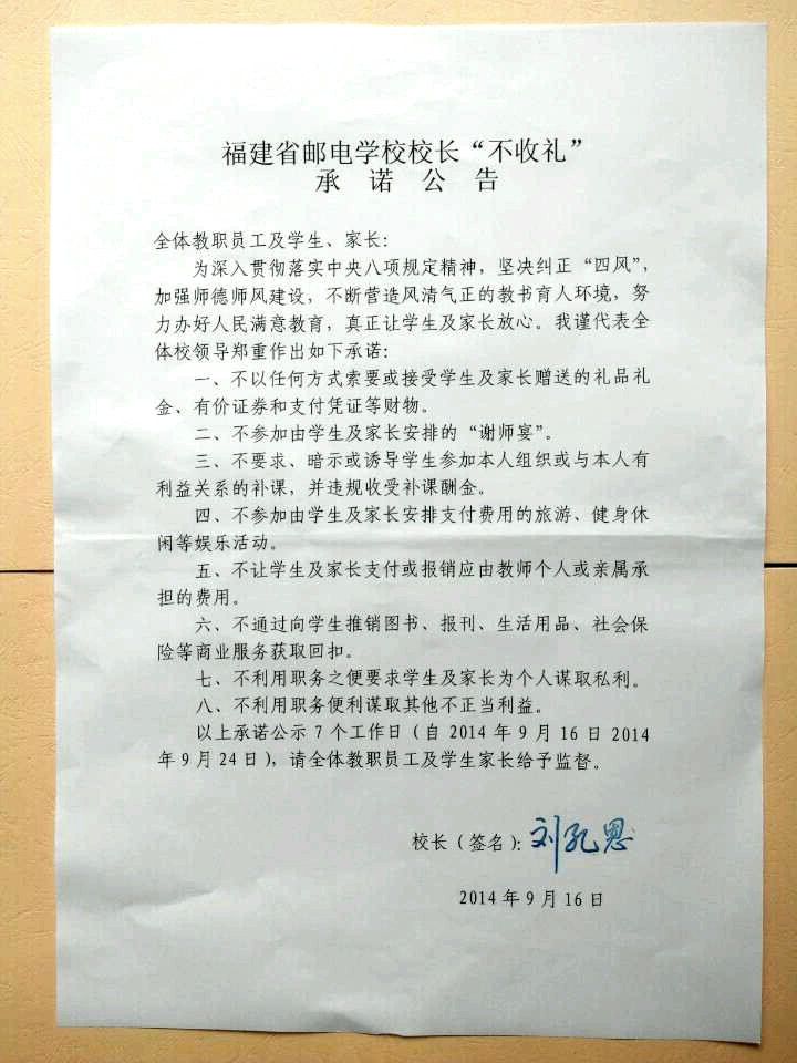 您現(xiàn)在的位置: 首頁(yè) > 學(xué)校信息 > 通知公告通知公告 關(guān)于教師節(jié)等節(jié)日期間學(xué)校教師中開(kāi)展“不收禮”的校長(zhǎng)承諾公告 發(fā)布時(shí)間:2014-09-16 //echo ;?> 來(lái)源:校黨辦點(diǎn)擊: 上一篇:通 知 下一篇:關(guān)于組織開(kāi)展2014年省特級(jí)教師評(píng)選工作的通知