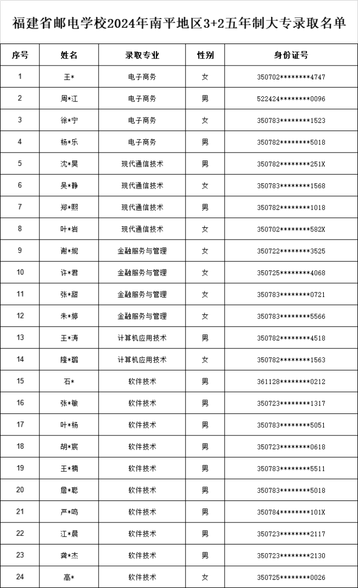 福建省郵電學(xué)校2024年南平地區(qū)3+2五年制大專錄取名單