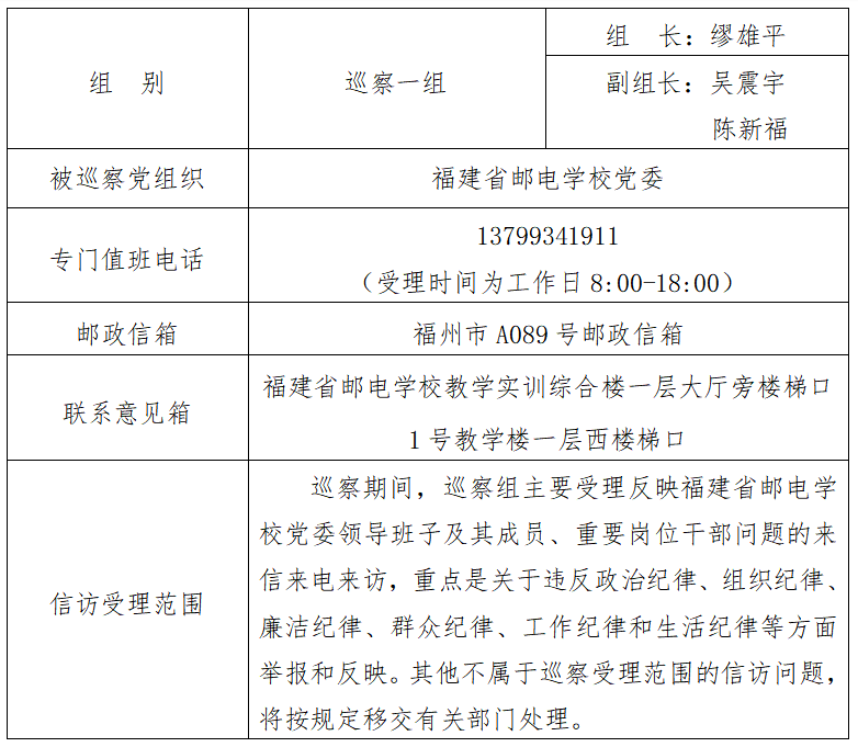 您現(xiàn)在的位置: 首頁(yè) > 學(xué)校信息 > 通知公告通知公告 巡察公告 發(fā)布時(shí)間:2025-06-16 //echo ;?> 來(lái)源:黨委工作科點(diǎn)擊: 按照省教育廳黨組巡察工作統(tǒng)一部署,廳黨組巡察一組自2025年6月16日起對(duì)福建省郵電學(xué)校黨委開(kāi)展為期30天左右的巡察。 中共福建省教育廳黨組巡察一組 2025年6月16日 上一篇:關(guān)于舉辦信創(chuàng)商用密碼應(yīng)用技術(shù)培訓(xùn)的通知 下一篇:省教育廳黨組巡察一組巡察福建省郵電學(xué)校黨委工作動(dòng)員會(huì)召開(kāi)